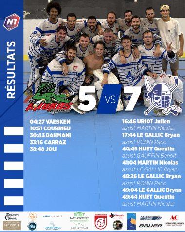 À l’entame de la seconde période ce sont les nîmois qui se montrent les plus réalistes et s’offrent un avantage de 3 buts (5-3 à 11 minutes du terme). Dans un sursaut d’orgueil, nos corsaires ont su relever la tête, garder le palet et dérouler leur jeu pour recoller au score et prendre l’avantage dans la dernière minute du match. Un dernier but en cage vide assurera la victoire de notre équipe. Score final 7-5.